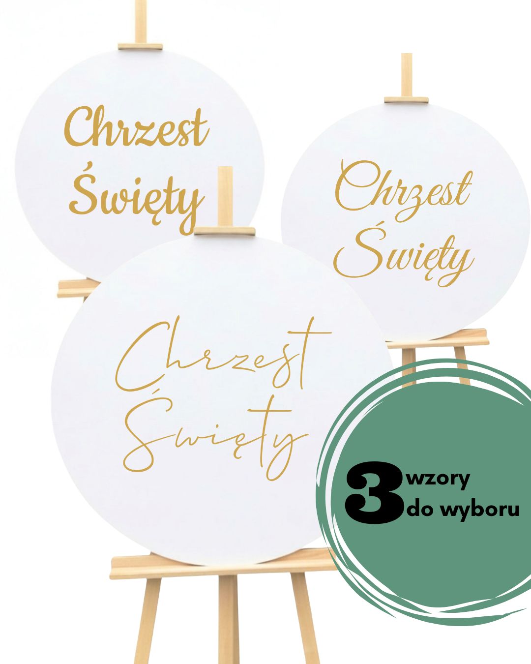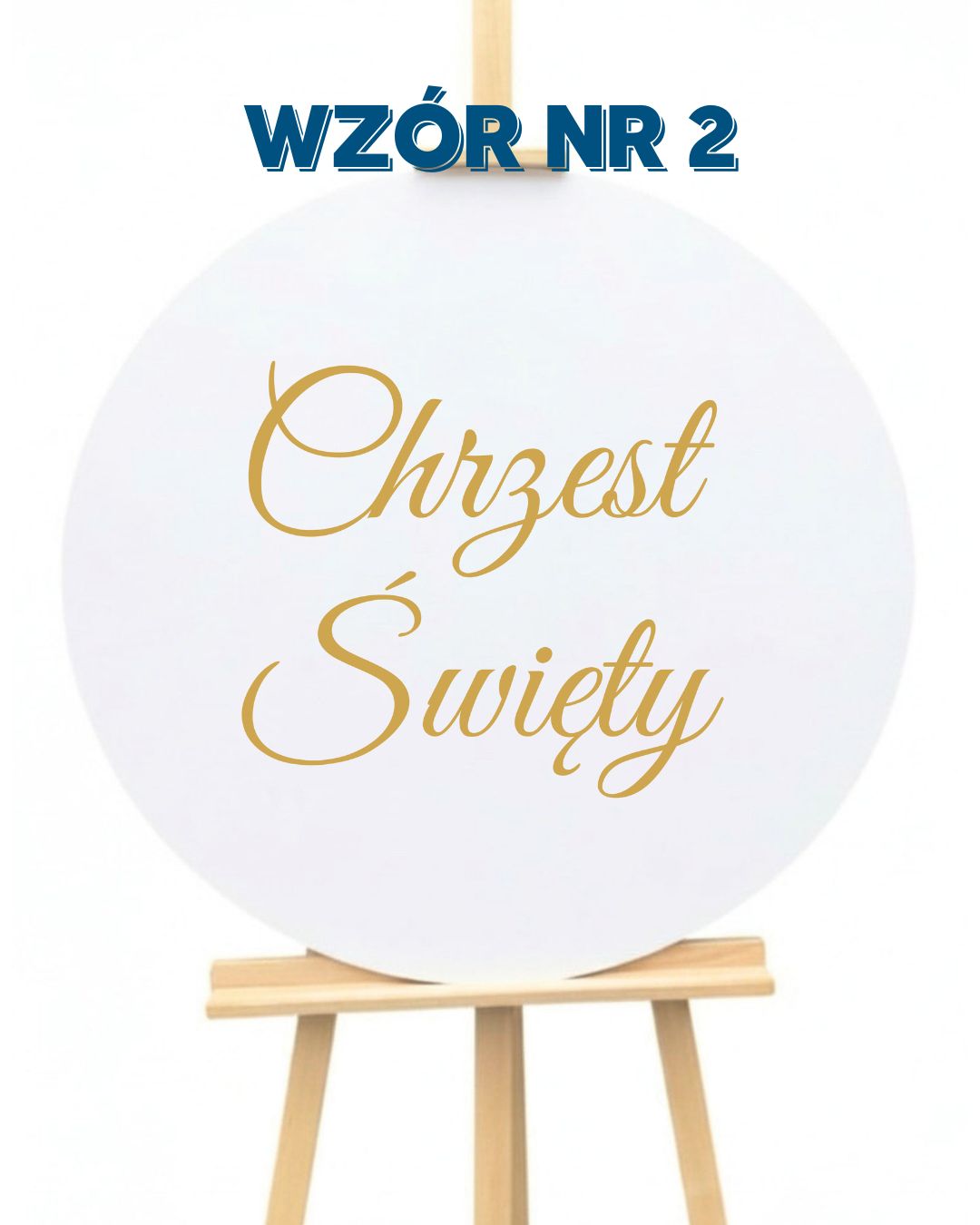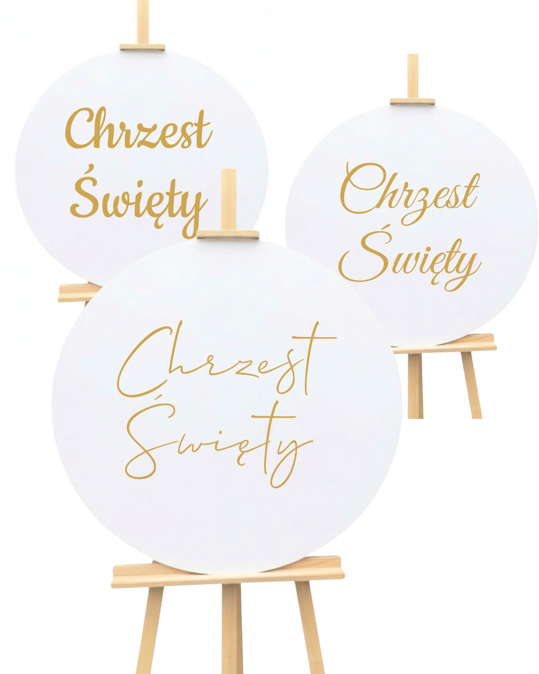 Tablica biała, okrągła ze złotym napisem Chrzest Święty, wykonanym z wysokiej jakości folii winylowej.