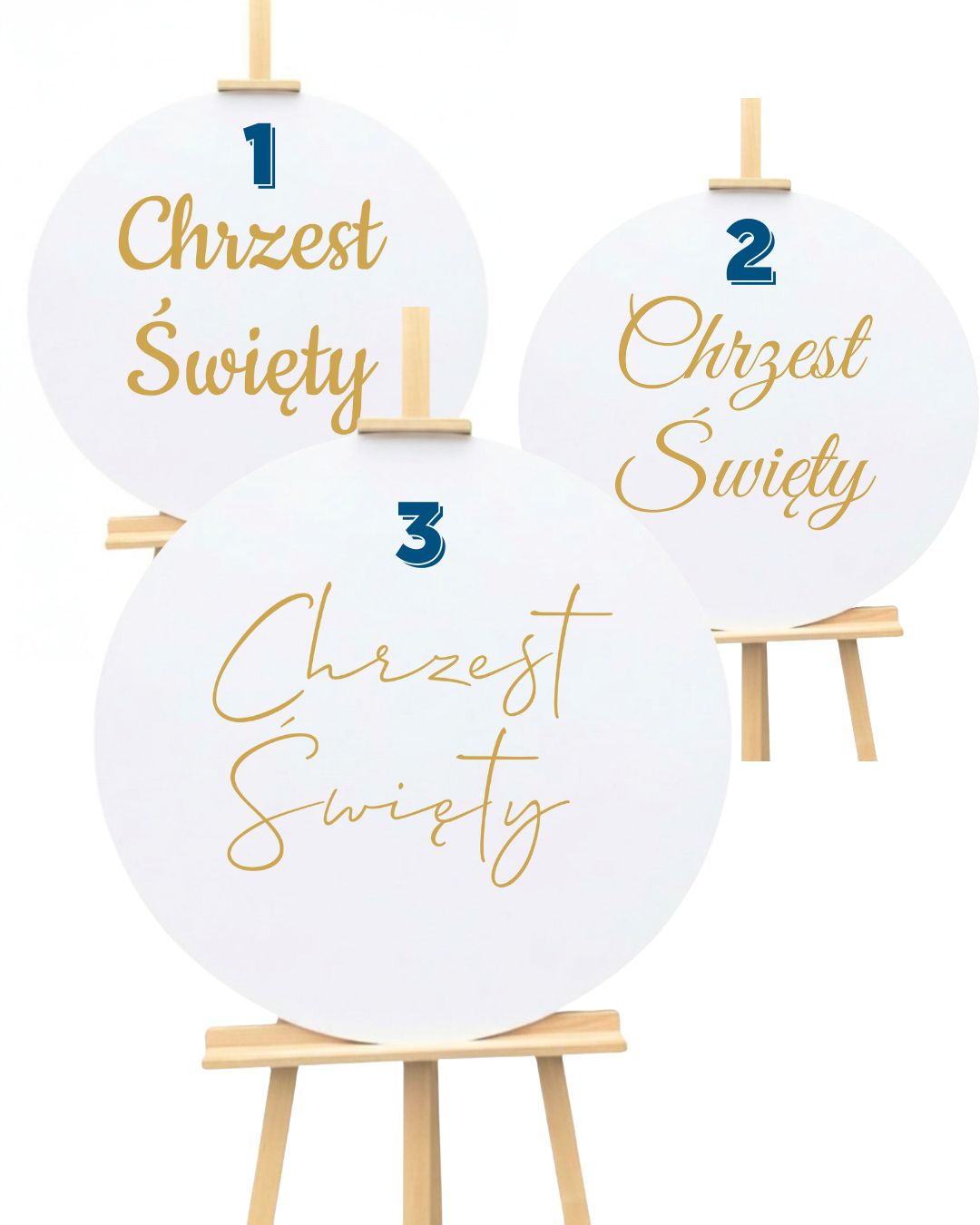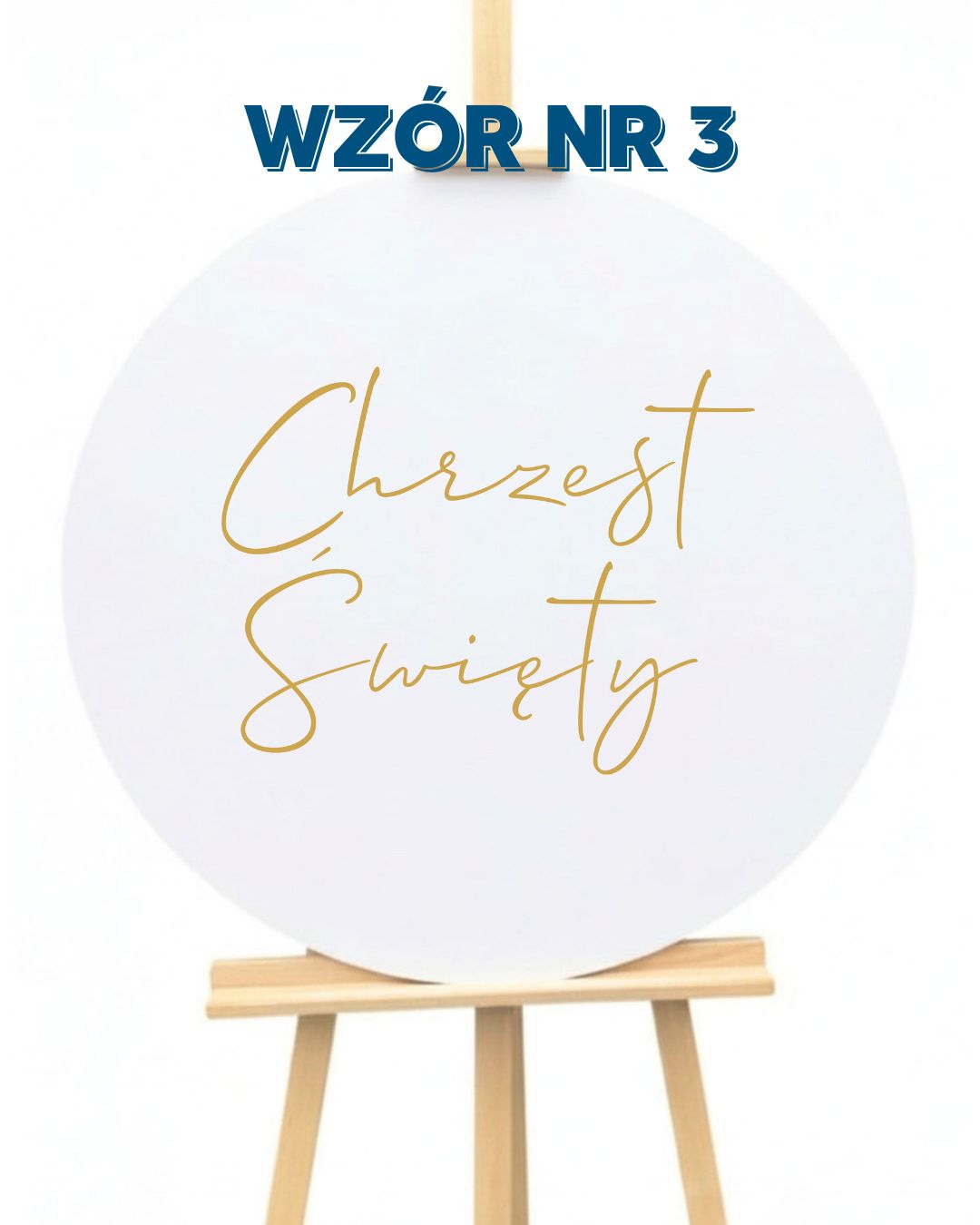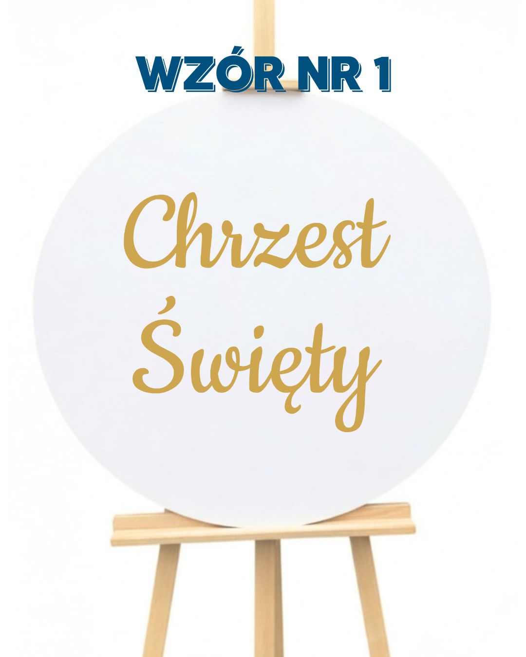 Tablica biała, okrągła ze złotym napisem Chrzest Święty, wykonanym z wysokiej jakości folii winylowej.