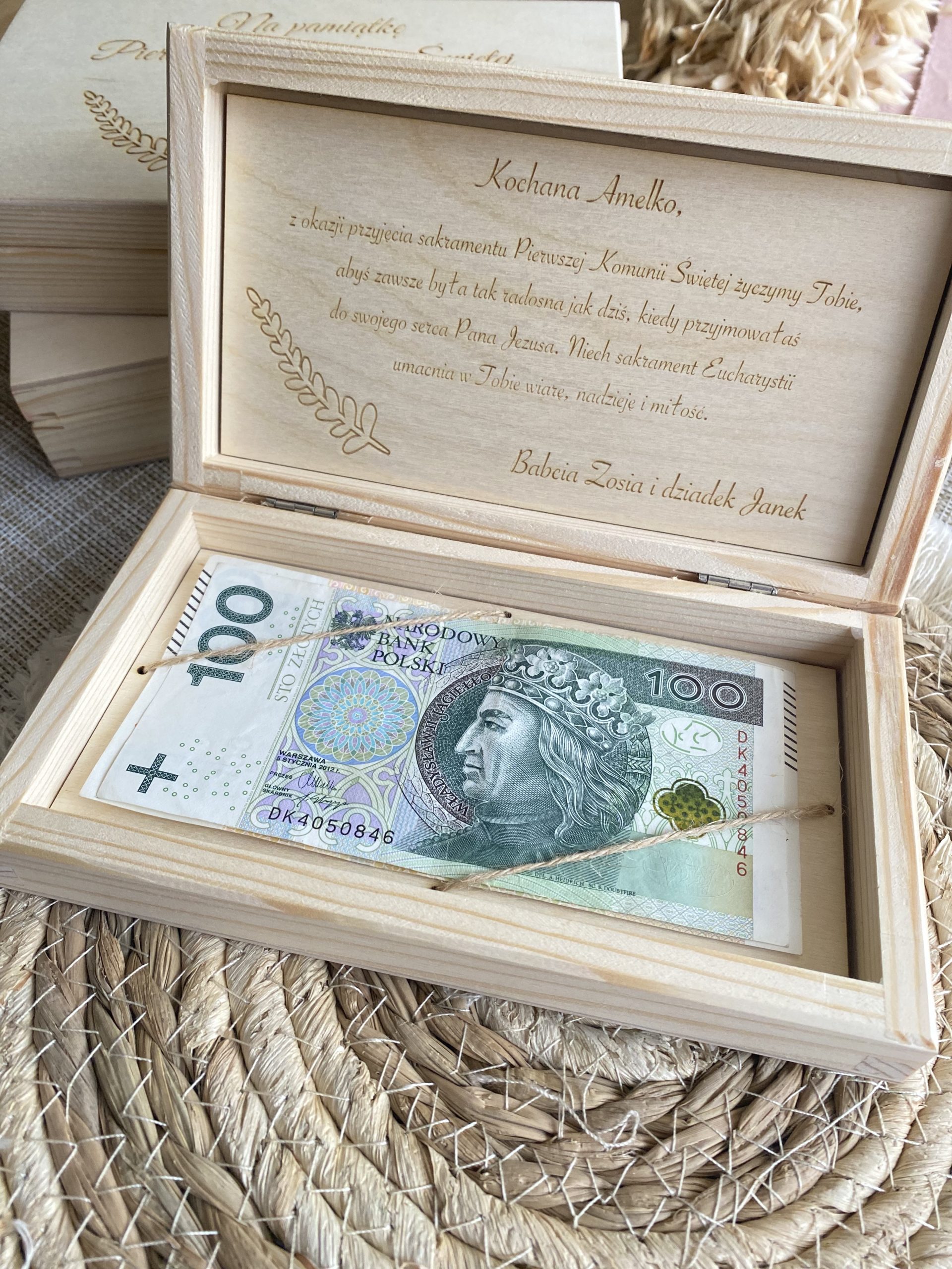 Po zakupie otrzymasz drewniane pudełko, zamykane na magnes, zapakowane w ozdobny kartonik. Na zewnątrz i w środku estetycznie wygrawerowane i wyszlifowane. Po otrzymaniu pudełka wystarczy że włożysz do środka pieniądze, kartonik przewiążesz dołączoną przez nas wstążką i prezent gotowy!
