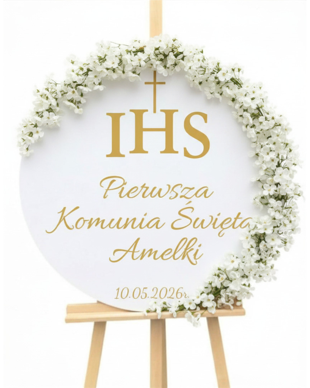 Dekoracja na sztaludze sprawdzi się przy wejściu do sali, w kościele lub w większym pomieszczeniu. Możesz dodatkowo udekorować ją pięknymi białymi kwiatami czy balonami, obok postawić latarenki, świece czy inne elementy, by dopełnić dekorację.