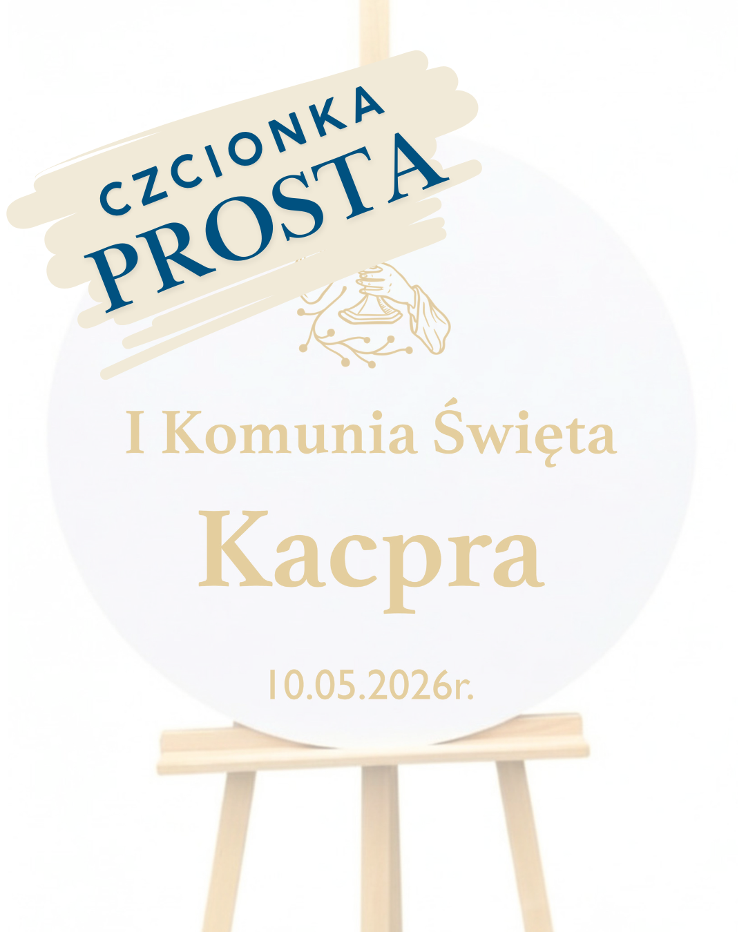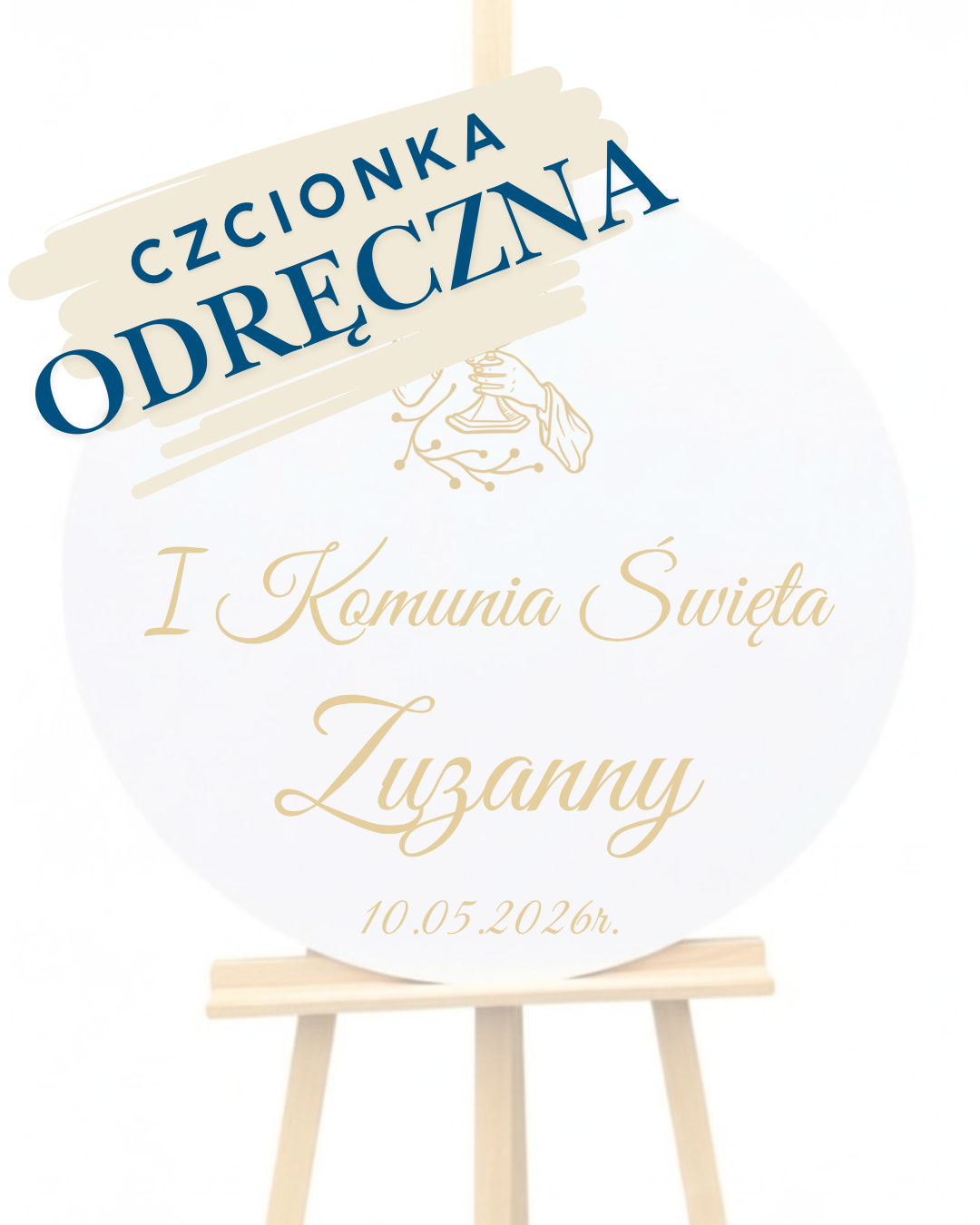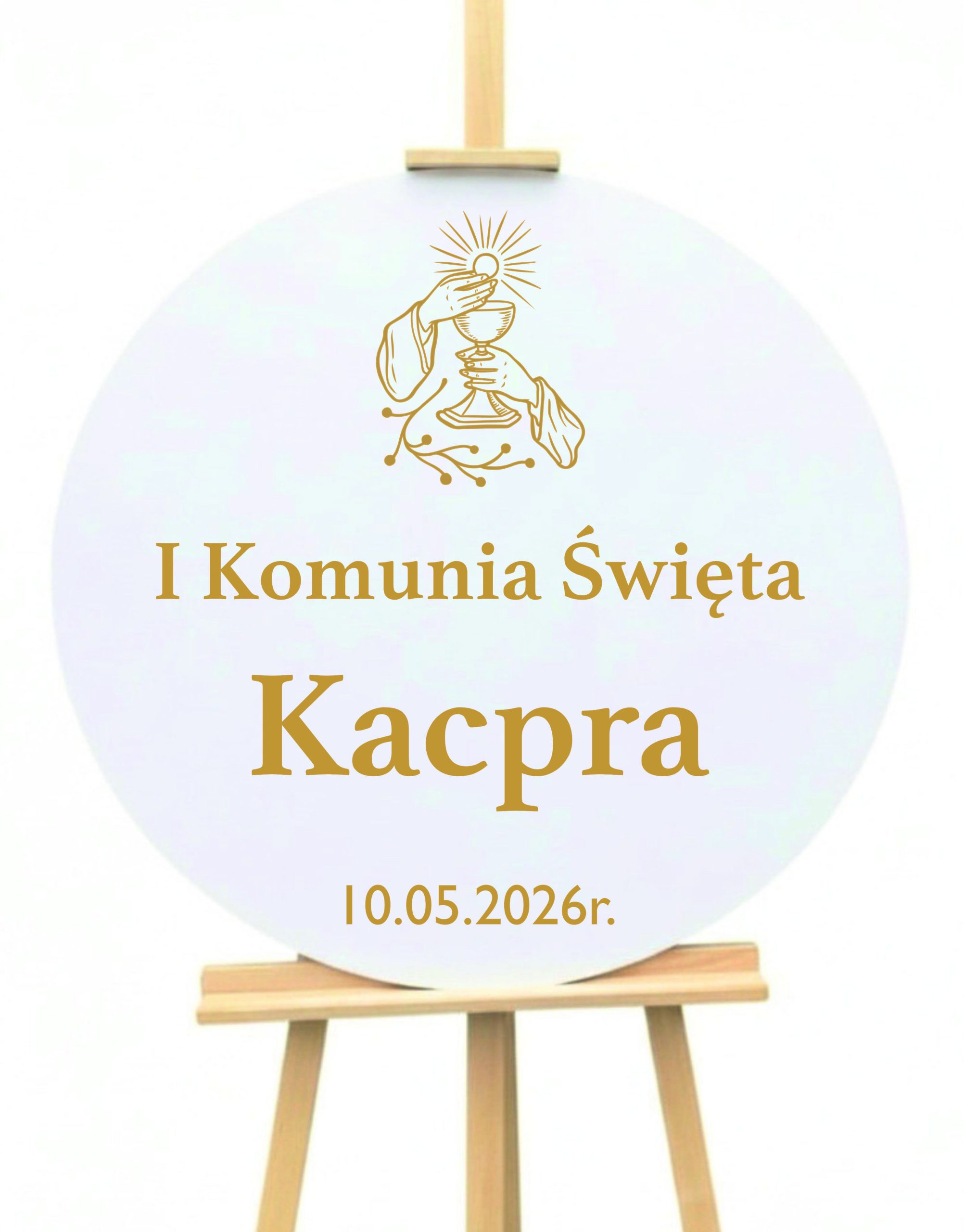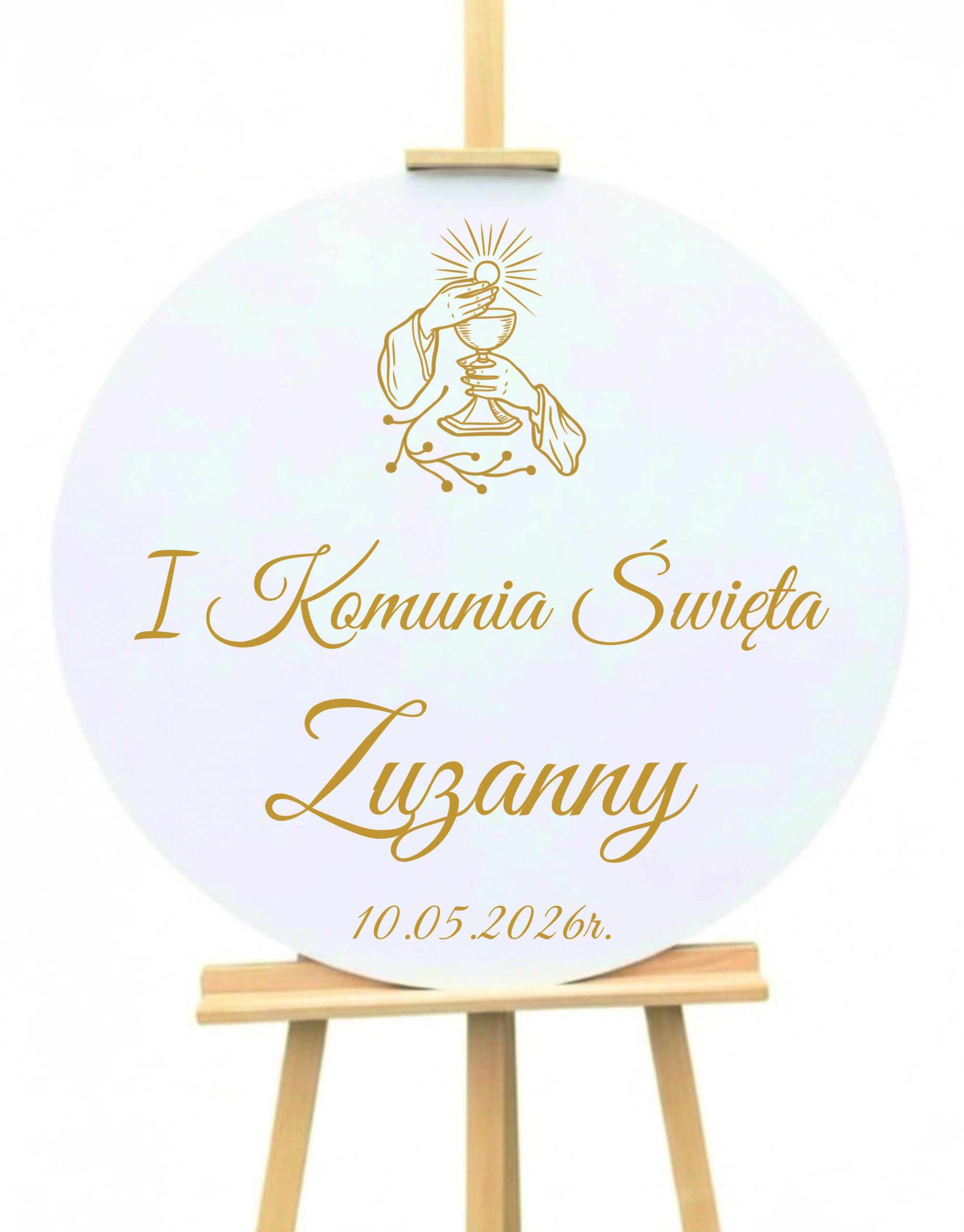 Okrągła tablica ze złotym napisem na komunię